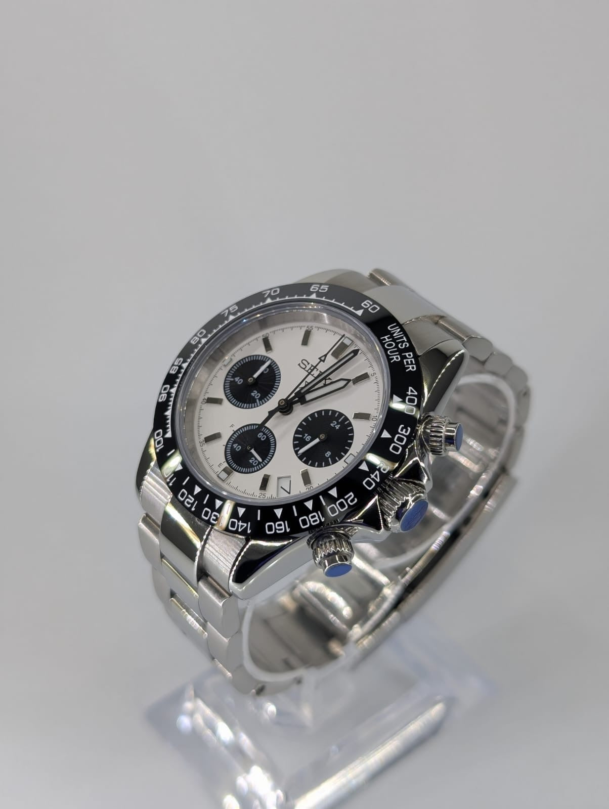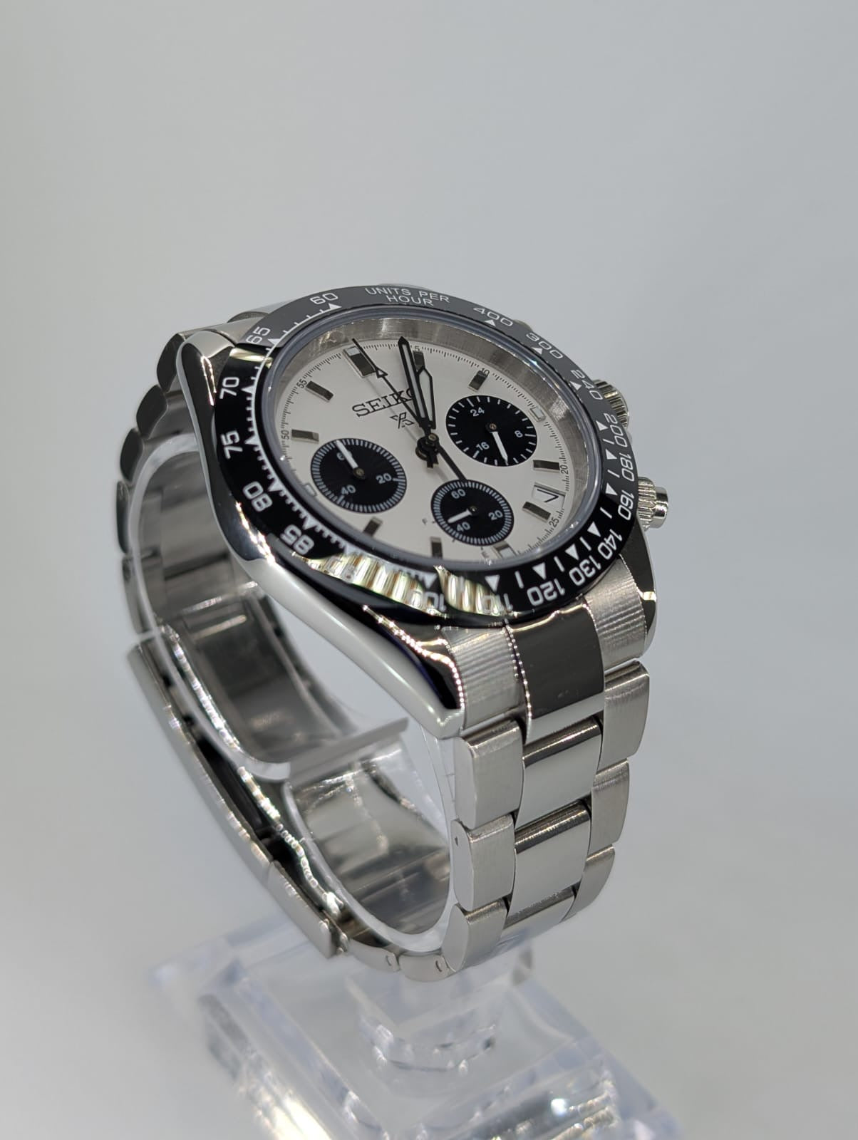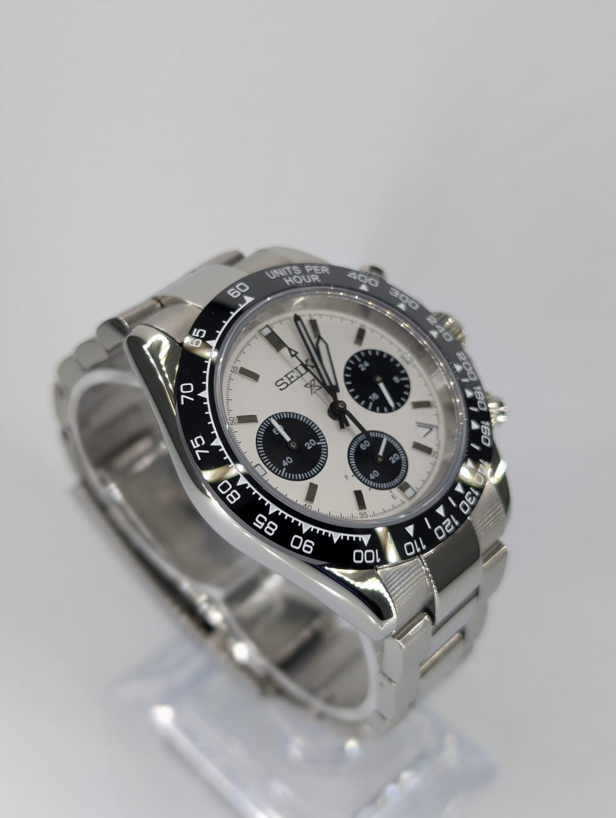 • Máxima Resistencia: La esfera "Panda" está protegida por Cristal de Zafiro, virtualmente imposible de rayar. Además, el bisel fijo con escala Taquimétrica te permite medir la velocidad.