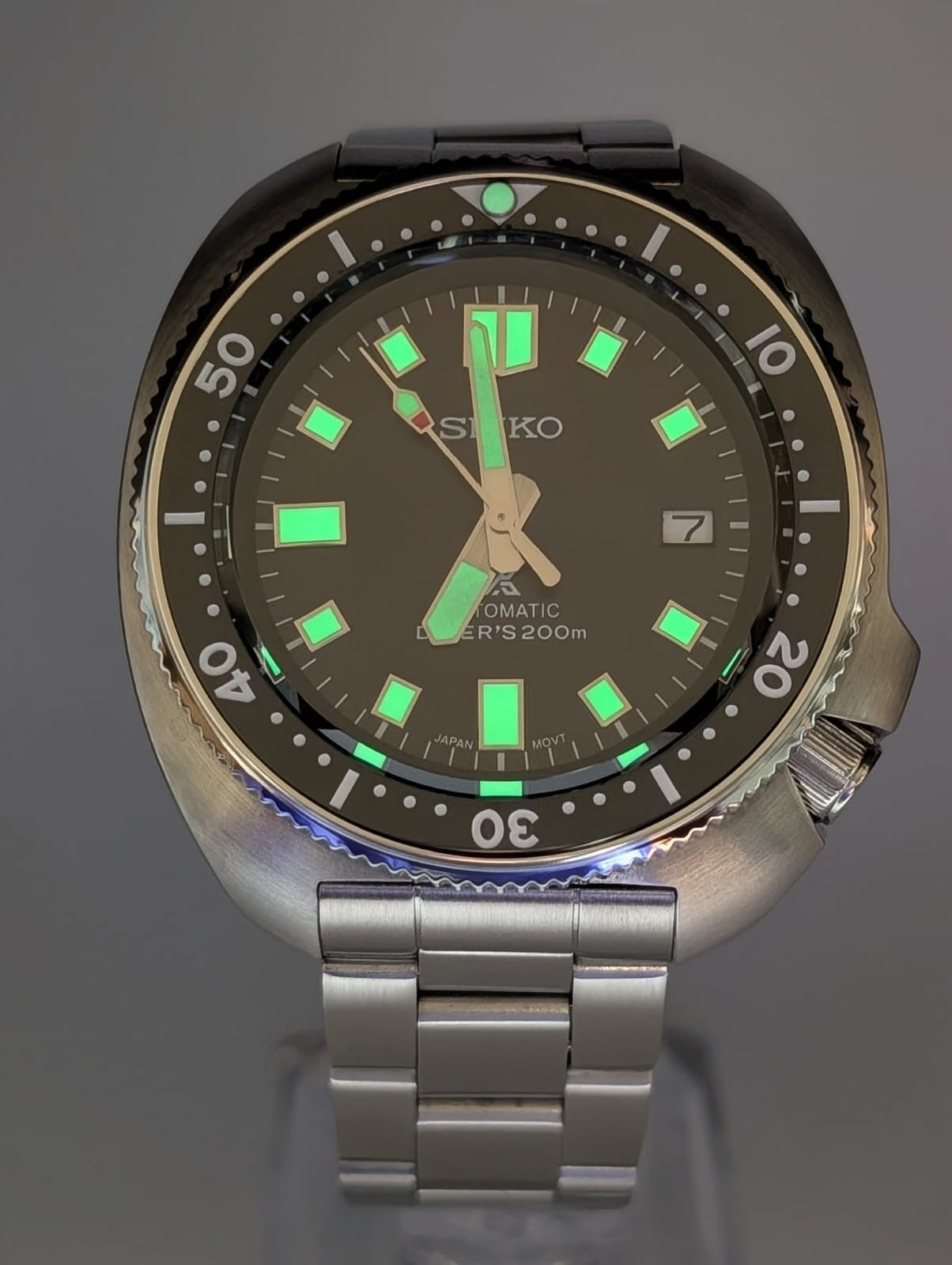 • Construcción Inconfundible: Equipado con la icónica caja de Acero Inoxidable 316L con forma de cojín ('Turtle' o 'Willard'), conocida por su comodidad ergonómica y durabilidad extrema.
