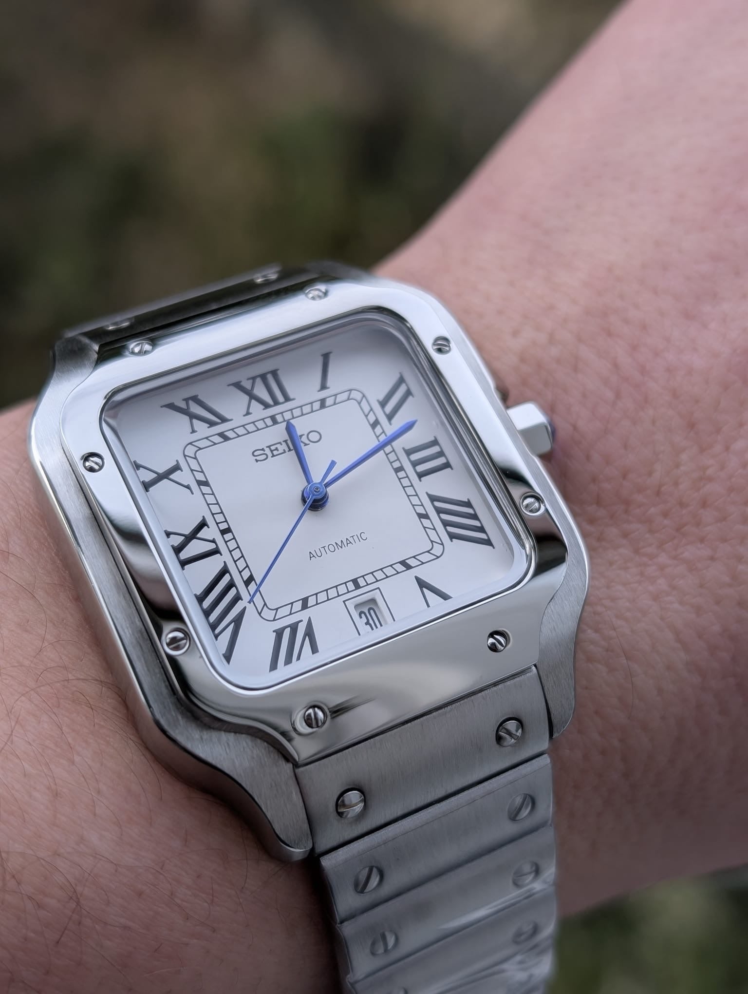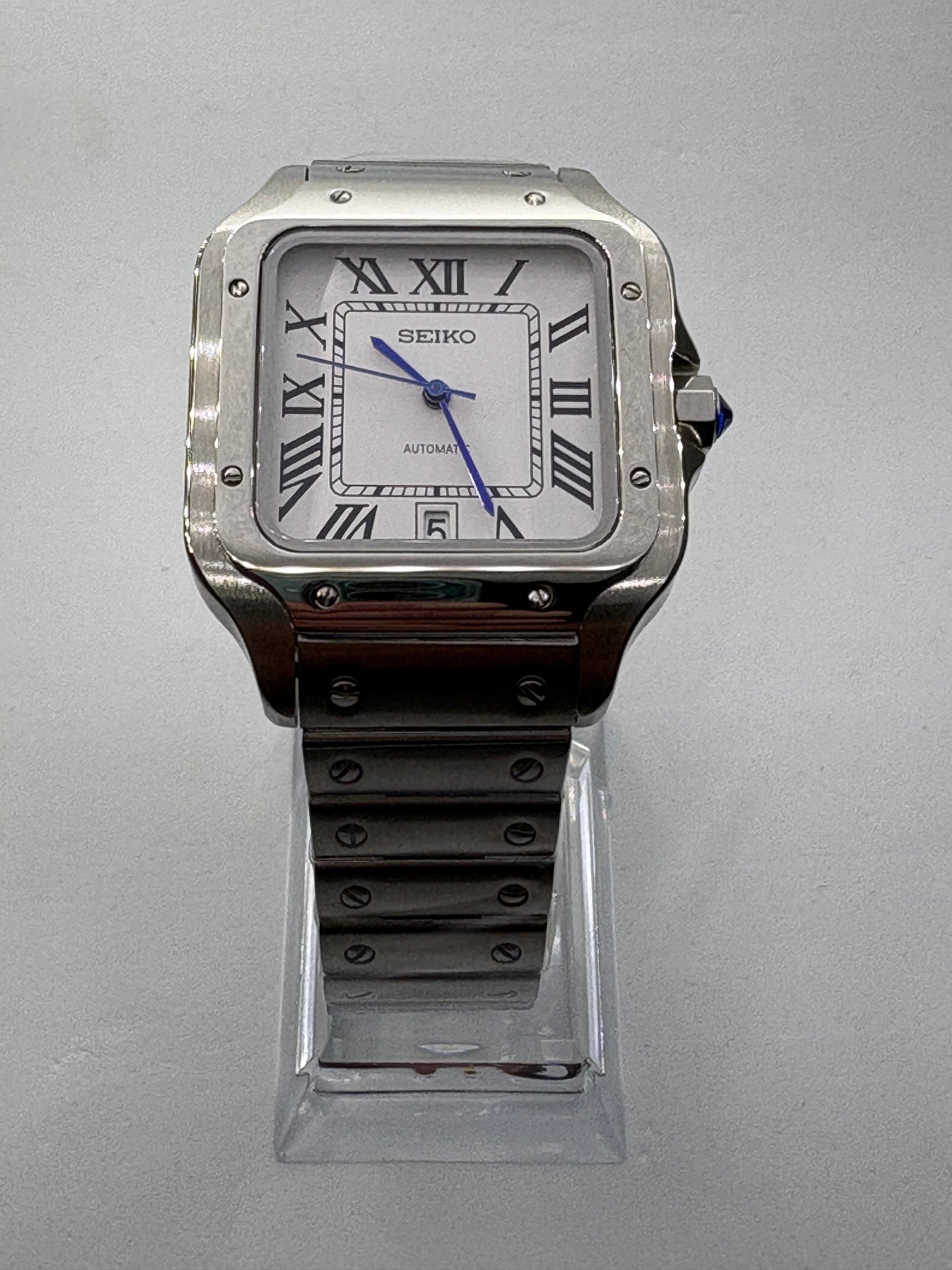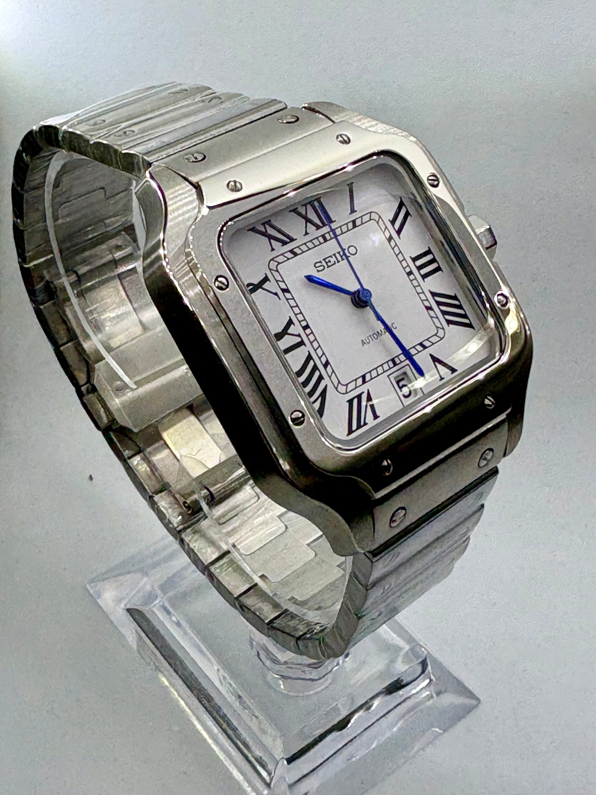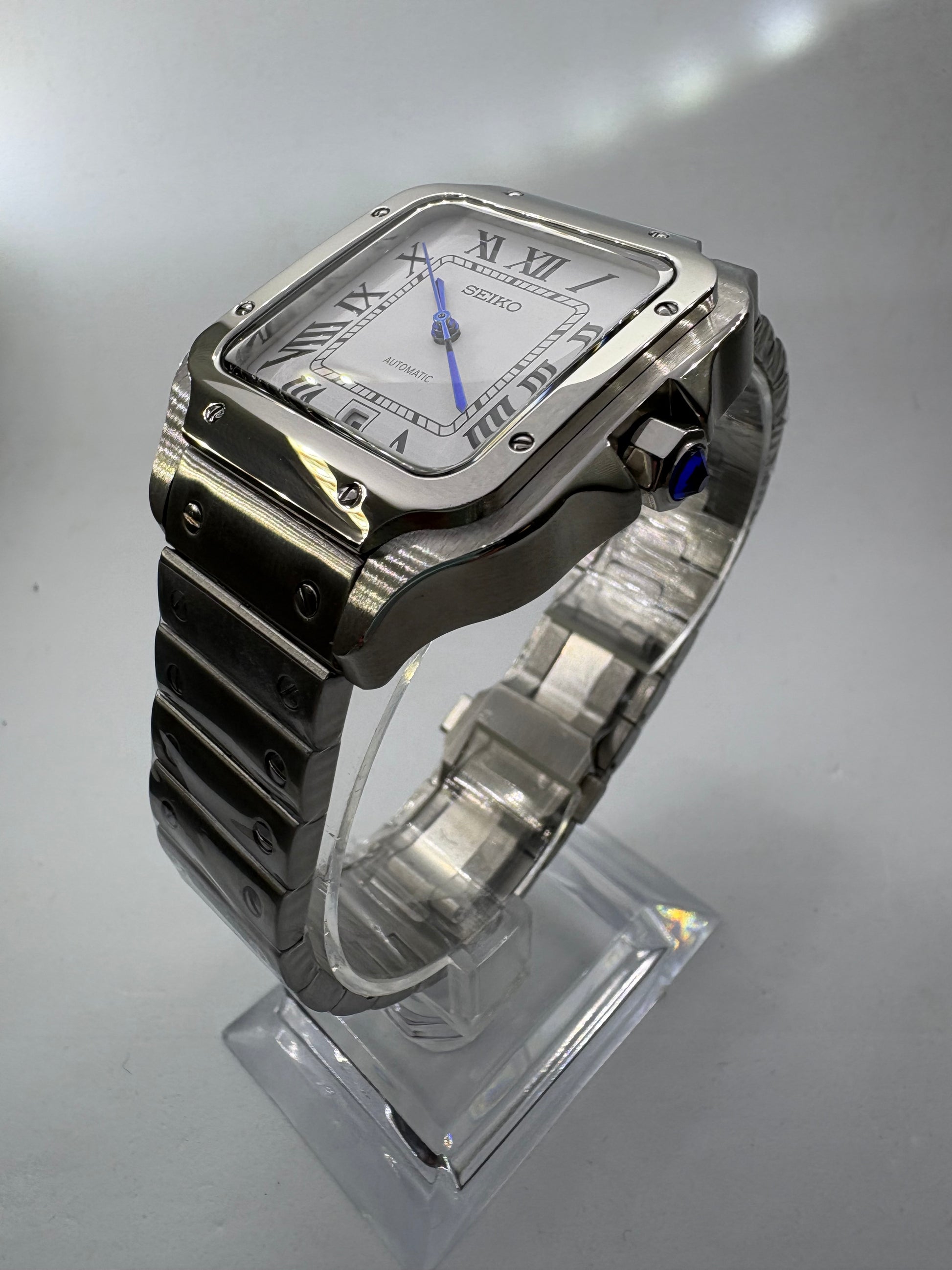 Su caja cuadrada de ángulos definidos y tornillería vista proyecta una personalidad arquitectónica y robusta. La esfera blanca con números romanos y el detalle del cabujón azul en la corona aportan ese aire de alta relojería que eleva cualquier estilo, desde el más formal hasta el diario urbano.